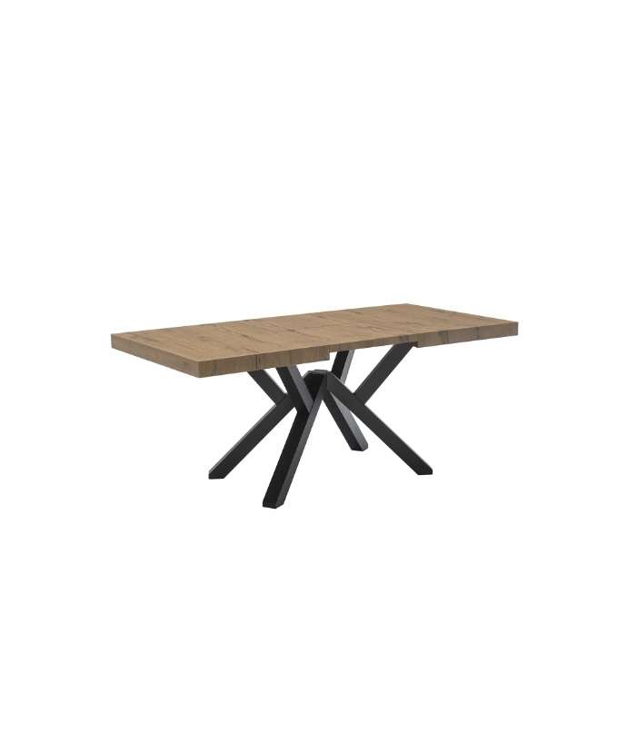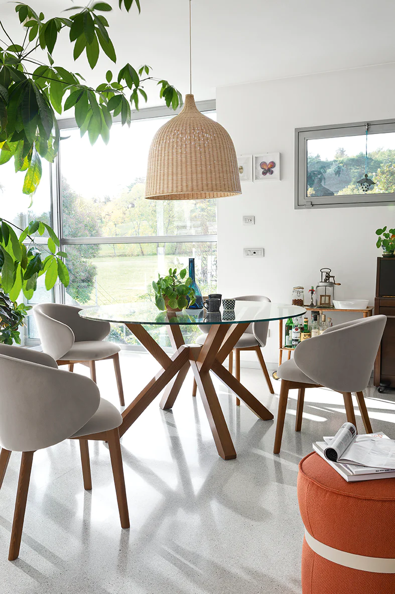 MIKADO è un tavolo rettangolare fisso con piano in vetro temprato e struttura e gambe in legno di faggio. La caratteristica principale di questo tavolo è il design del basamento, con i cavalletti che vengono uniti da un elemento in metallo verniciato nero.