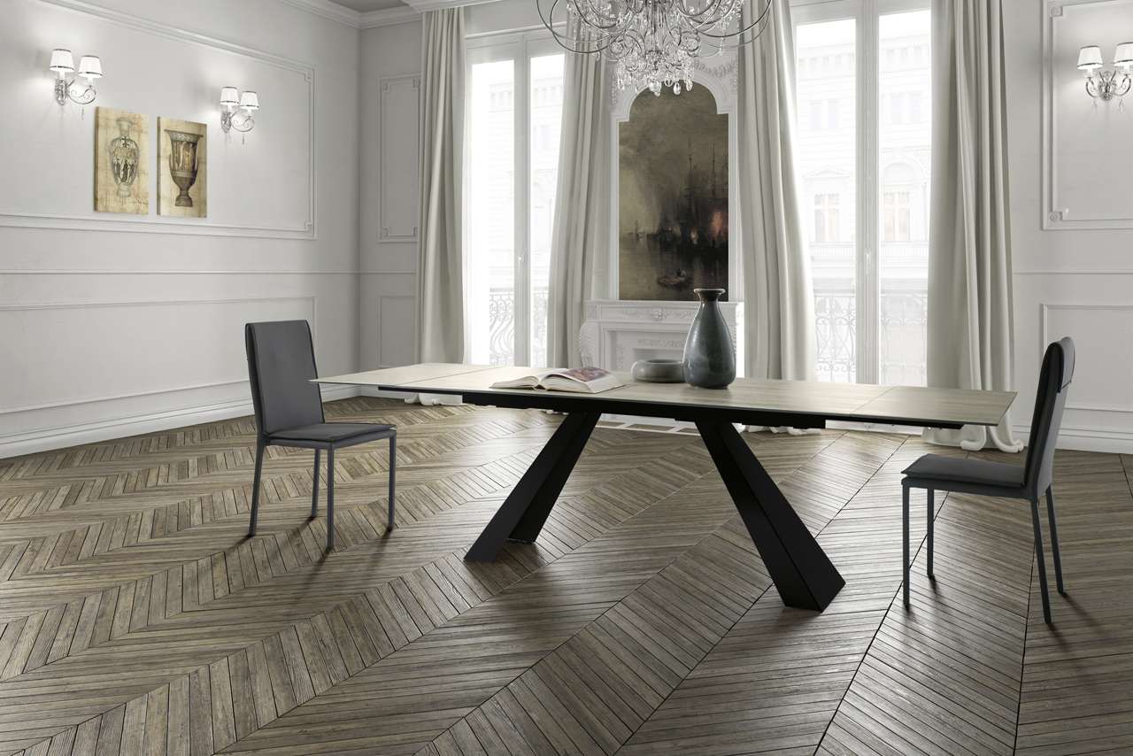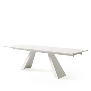 Tavolo fisso o allungabile con basamento in metallo verniciato e piana disponibile in finiture e dimensioni differenti, sia nella versione allungabile che nella versione fissa.