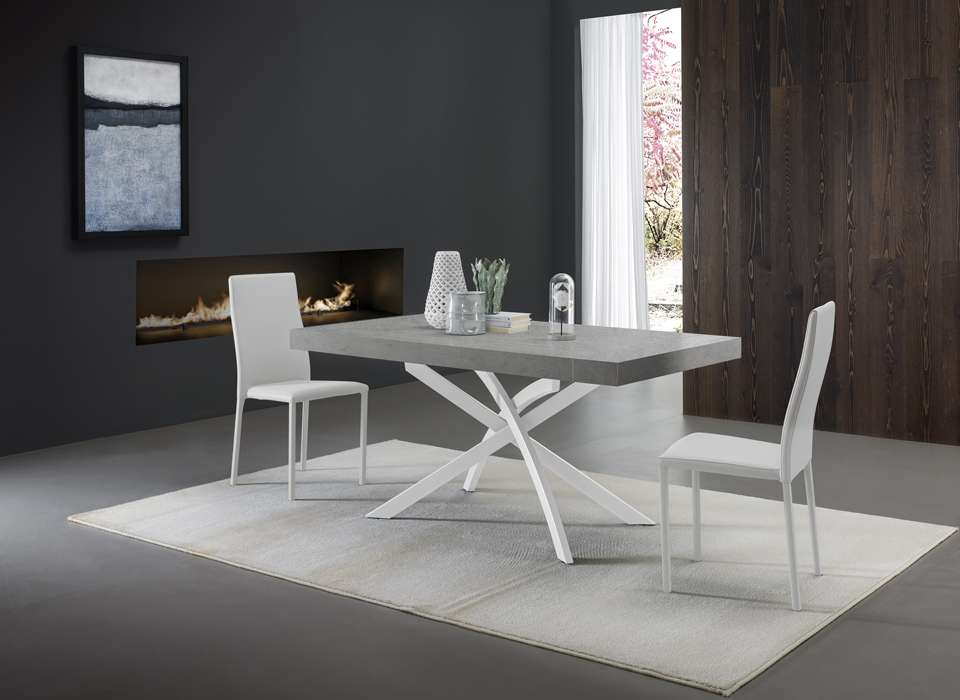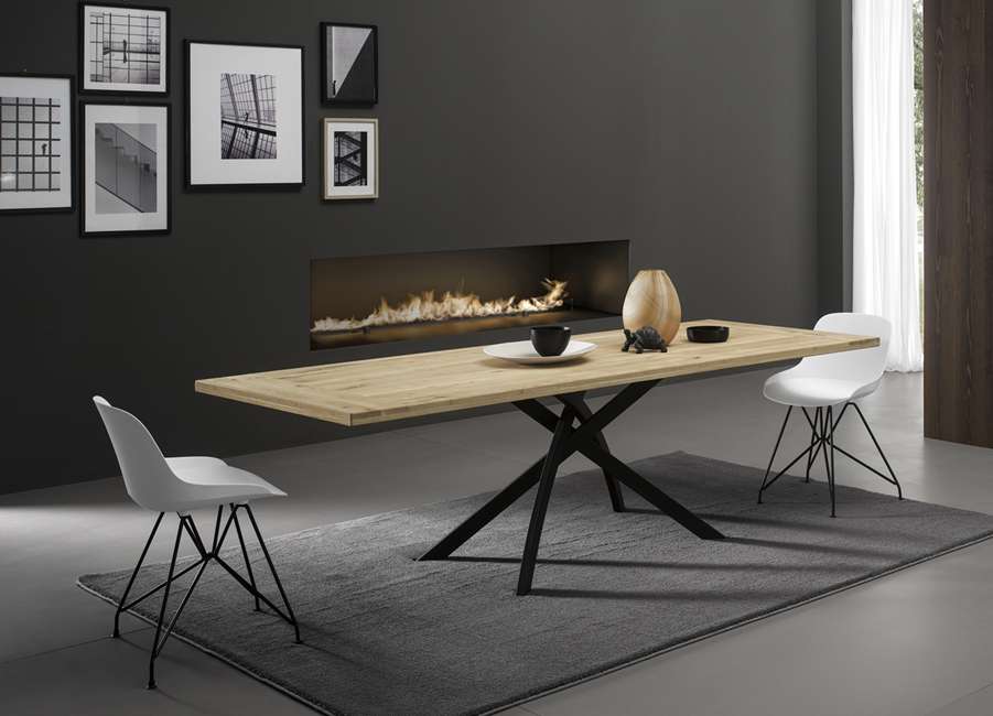 Tavolo fisso o allungabile con basamento in metallo verniciato e piana disponibile in finiture e dimensioni differenti, sia nella versione allungabile che nella versione fissa.