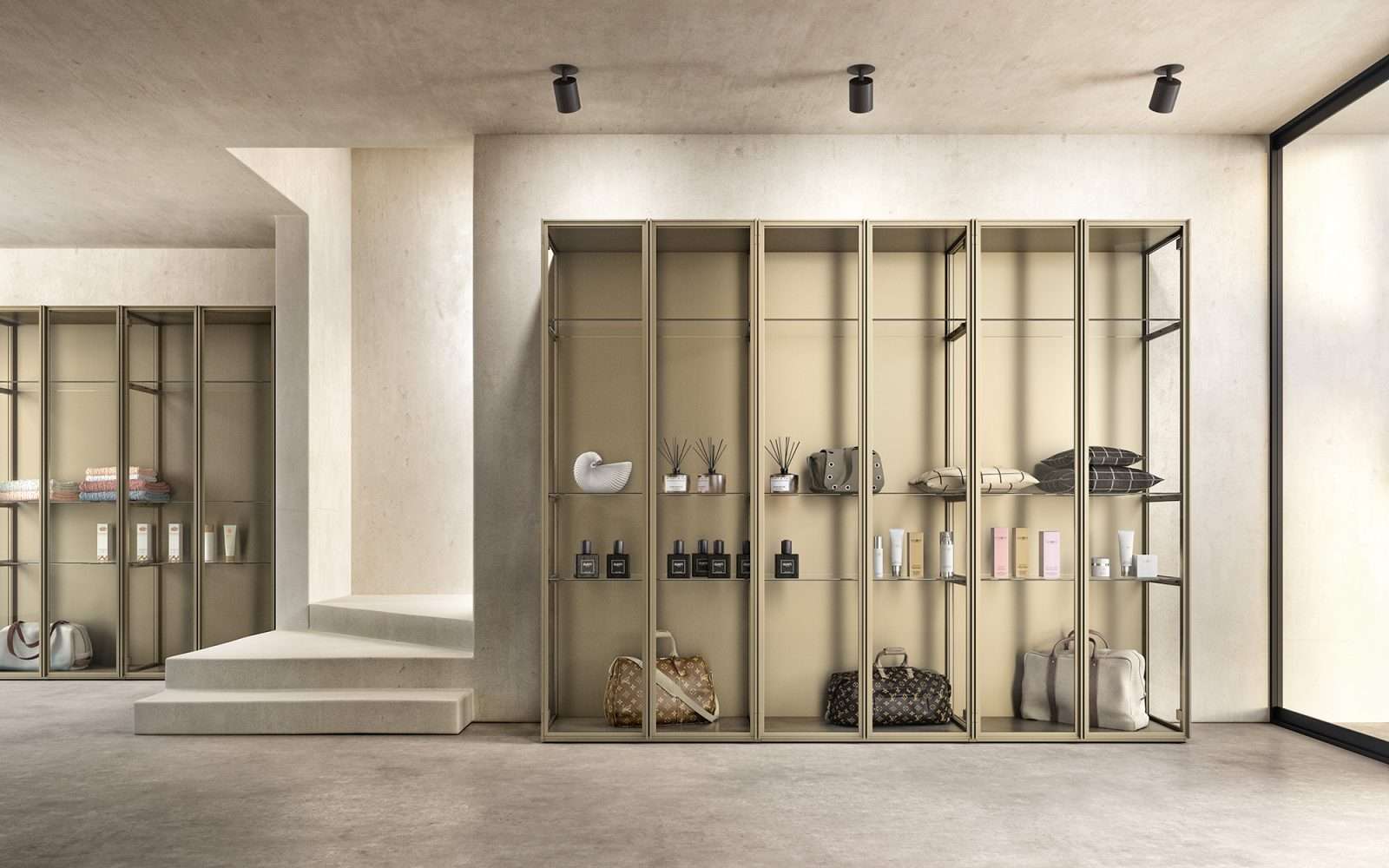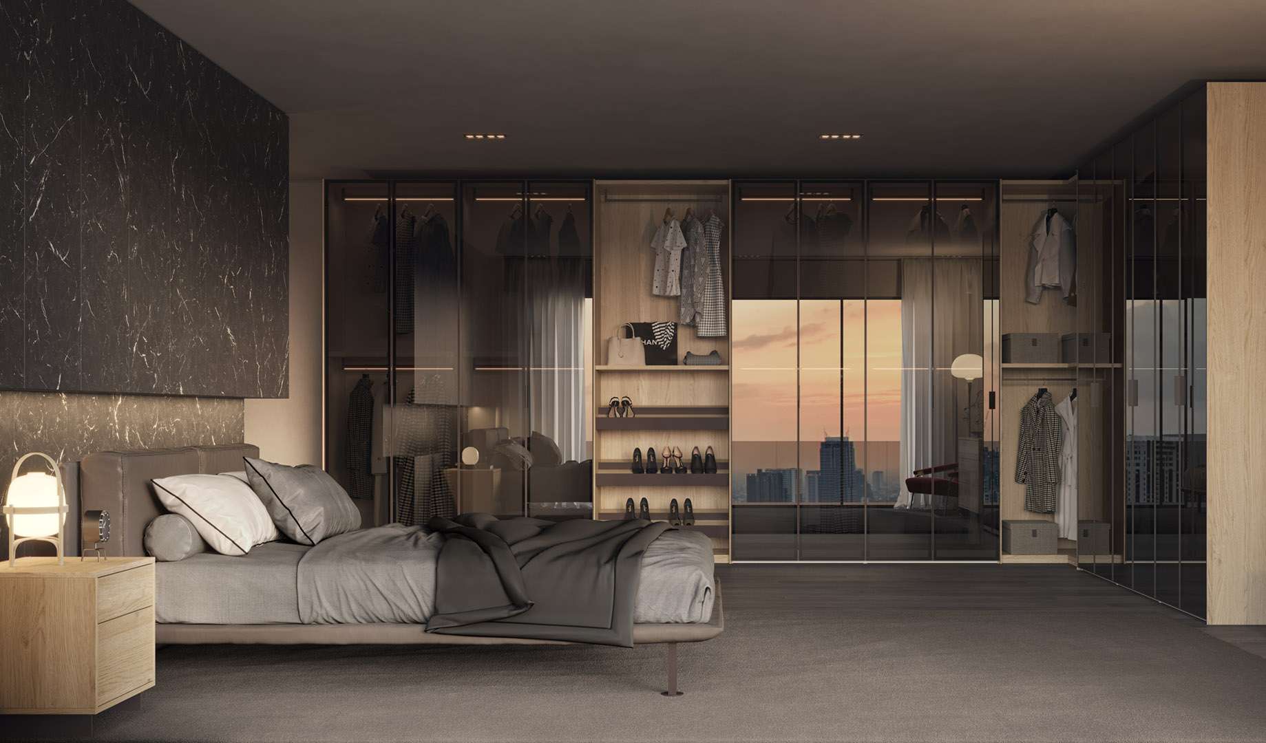 Le ante modell filo sono costruite da u esile profilo perimetrale in allumini completo di maniglia incassata. E’ disponibile con pannello, con vetro laccato oppure