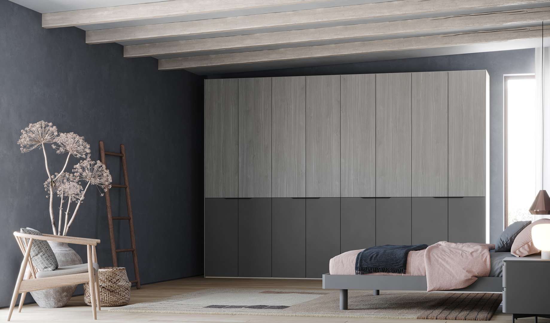 L’armadio dalle linee pulite e rigorose ma completamente adattabile ad ogni tipologia di parete o situazione anche la più difficile dal punto di vista architettonico.