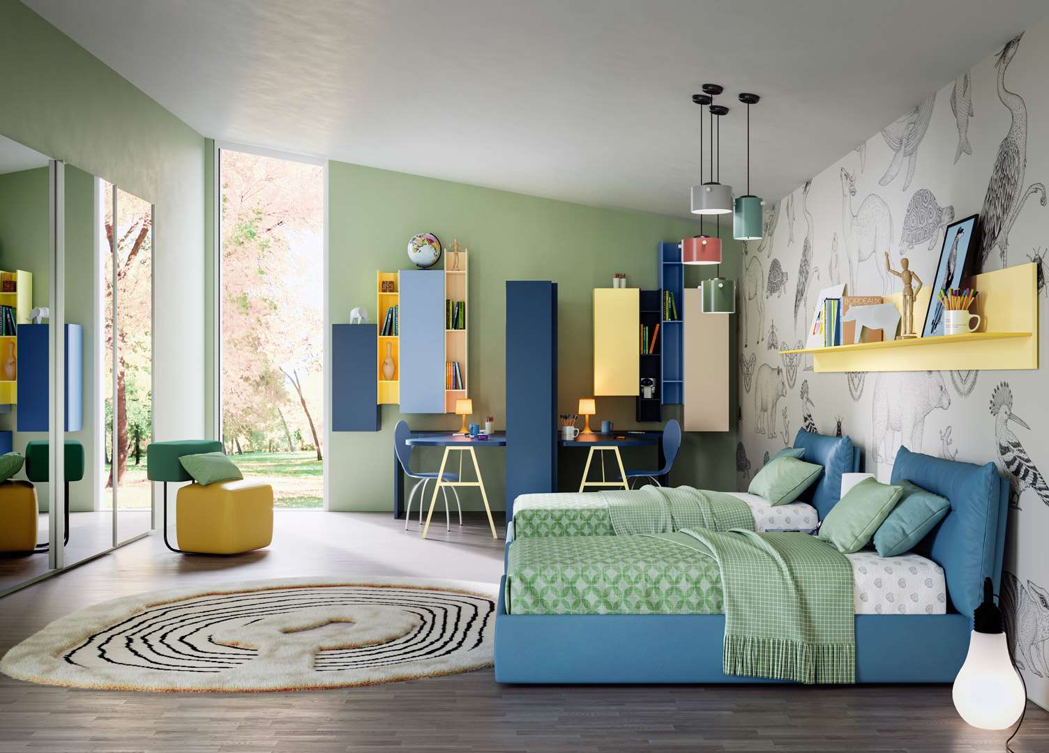 CM307 Giocosa, vivace, dinamica. Una cameretta con letto a castello, armadio battente con cassetti, scrivania e mobile basso.