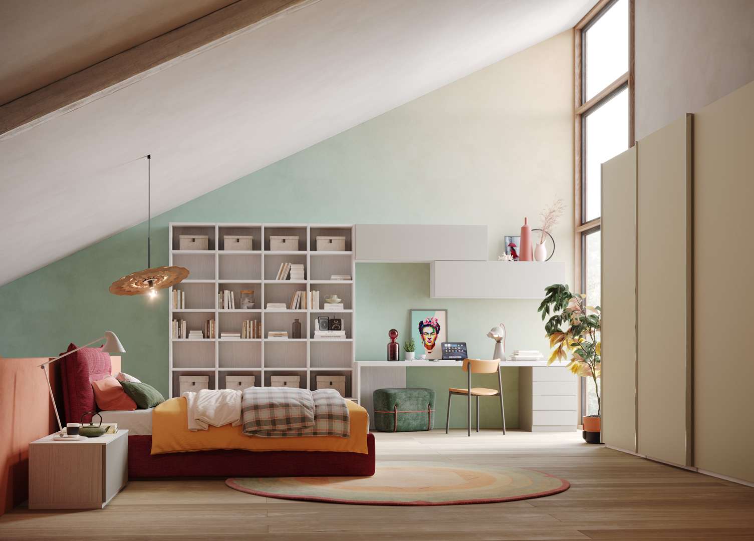 CM305 Spazio funzionale in linea con le esigenze e i desideri di ragazzi e ragazze, con armadio scorrevole, libreria e ampia scrivania.