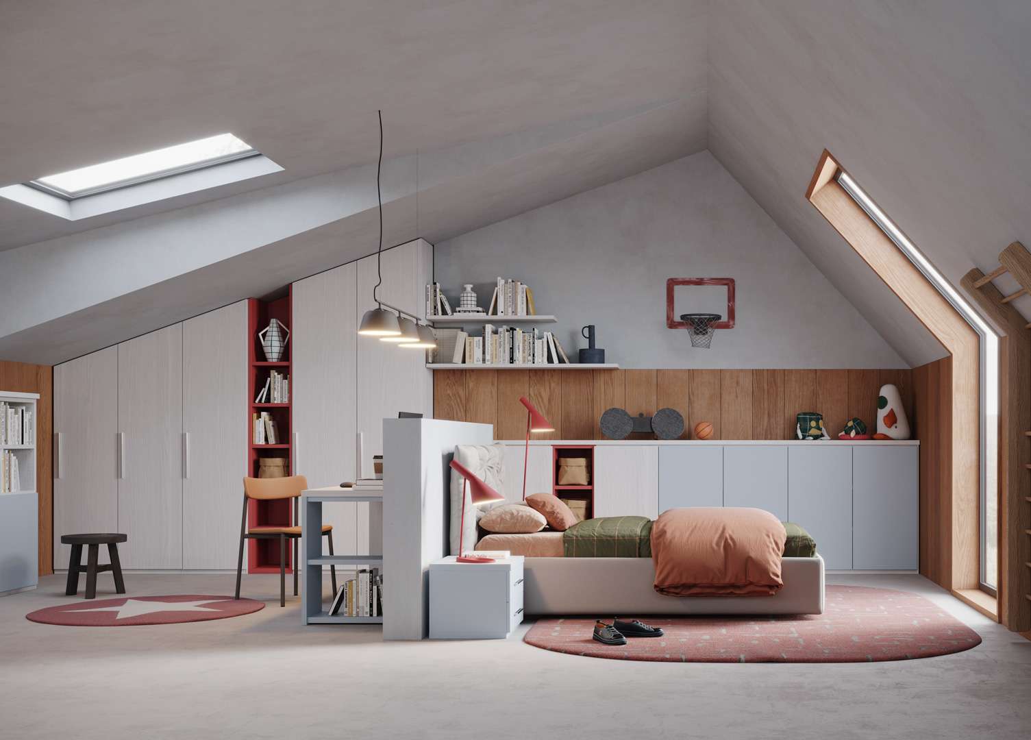 CM309 Colori vivaci interrompono la monotonia dei colori tenui in una cameretta per ragazzi, con armadio battente mansardato per sfruttare tutto lo spazio in altezza.