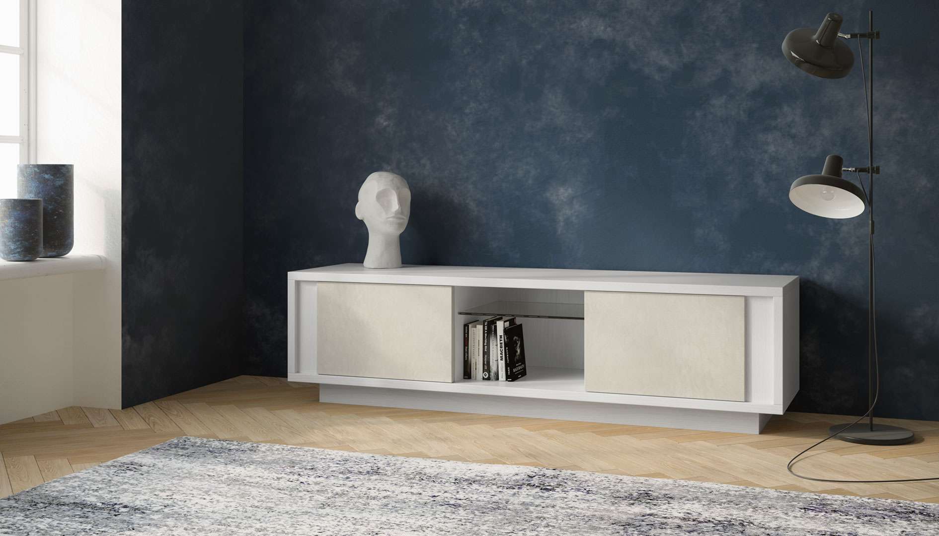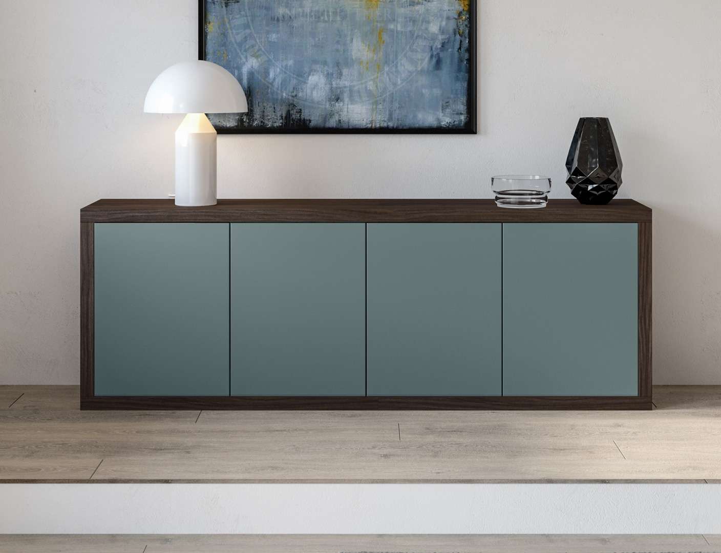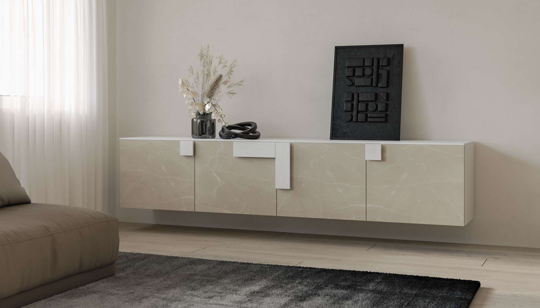 Tra le madie sospese, questo modello mischia perfettamente l’effetto materico e il nobilitato per un risultato di classe, reso leggero dal fatto che il il