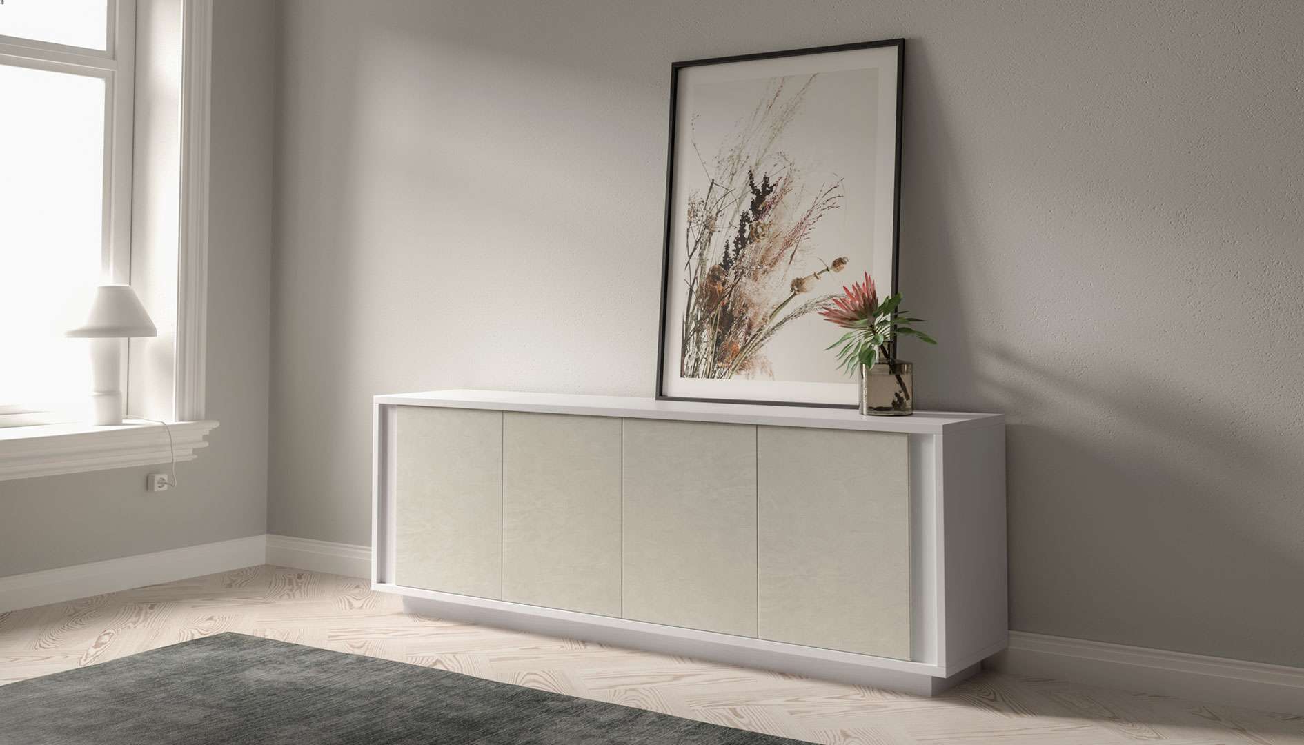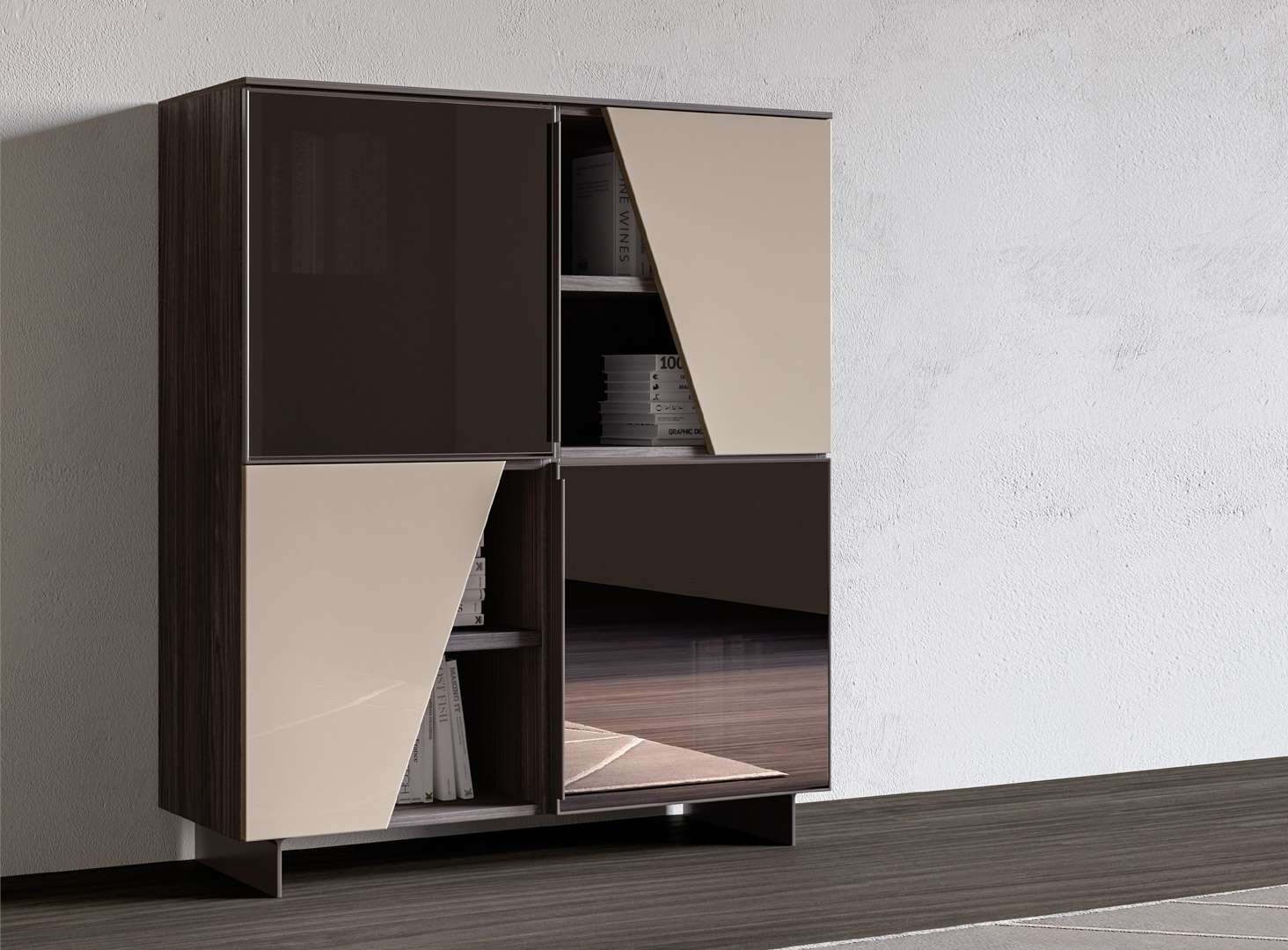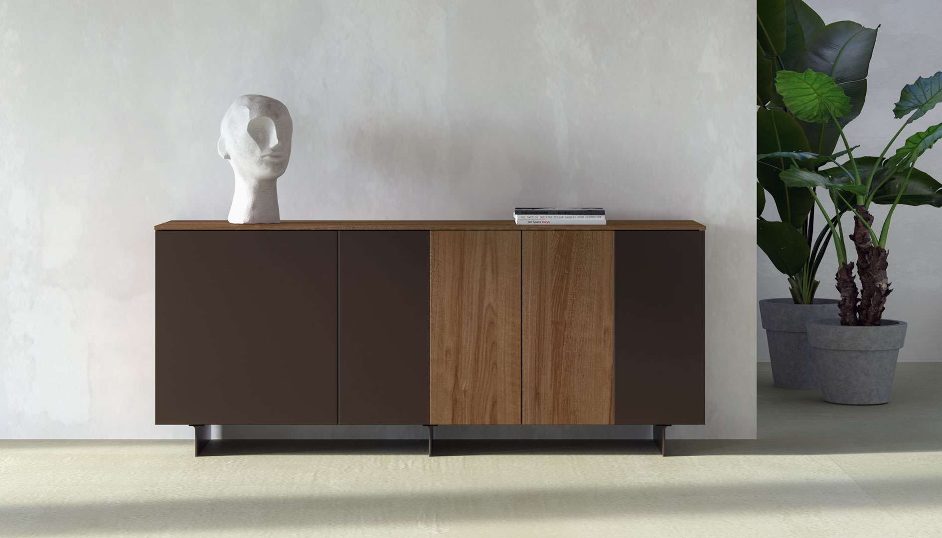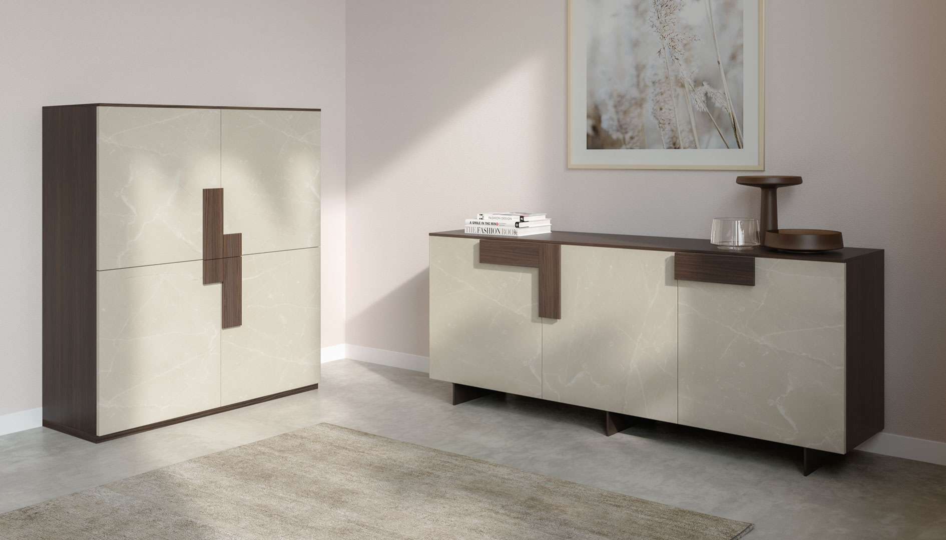Tra le madie sospese, questo modello mischia perfettamente l’effetto materico e il nobilitato per un risultato di classe, reso leggero dal fatto che il il