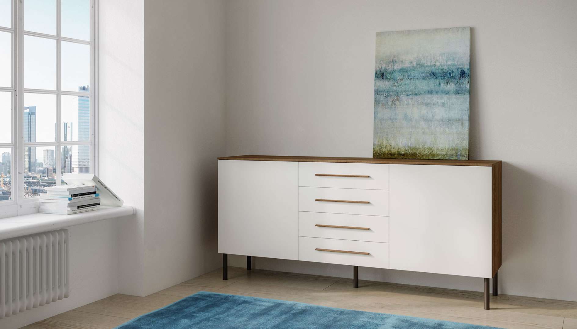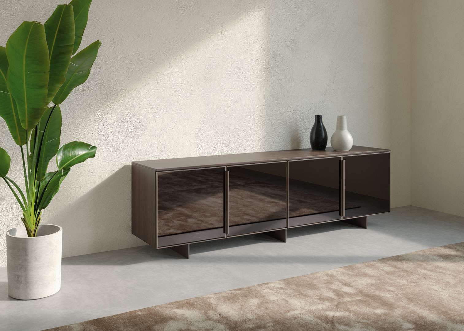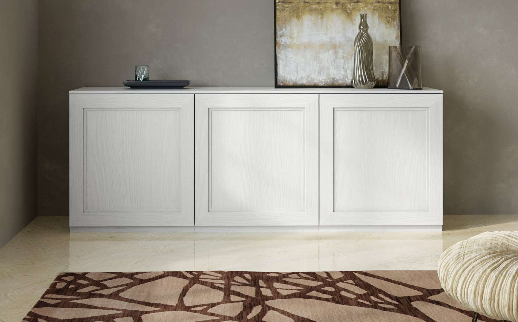 Madia caratterizzata da un elegante supporto boiserie.La versatilità di Sasha si esprime sia per le diverse soluzioni di composizioni, sia per la possibilità di coordinare