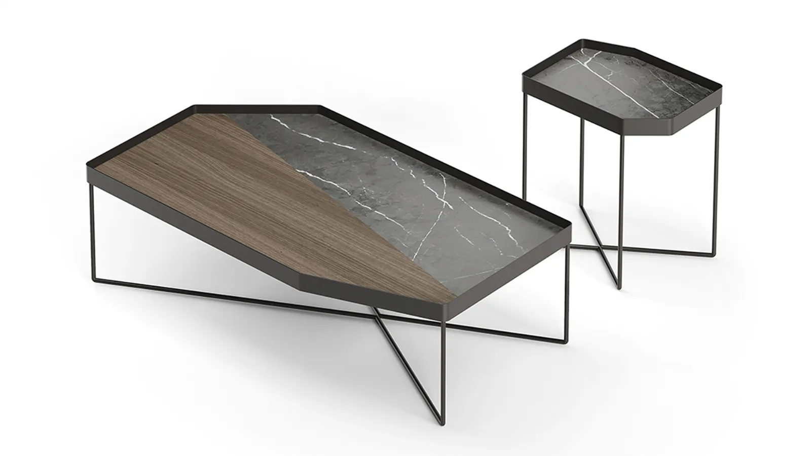 Tavolino dalle forme irregolari con piano in legno e pietraTavolni di design dalla forma irregolare realizzati con un struttura in metallo e piani disponibili in