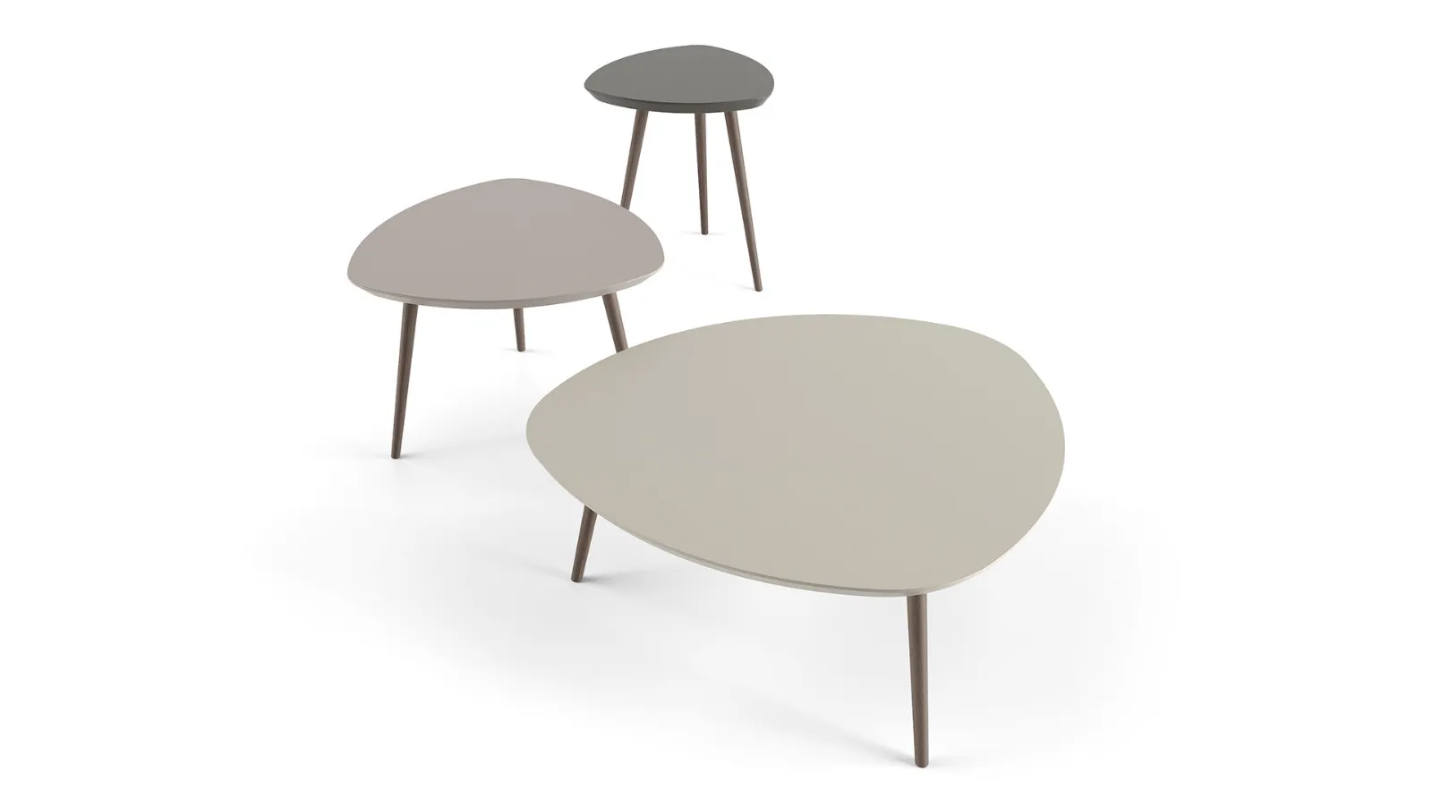 Tavolino a tre gambe in legnoTavolino moderno dal design scandinavo costituito da un piano in MDF pantografato con bordo a 45° e forma triangolare con