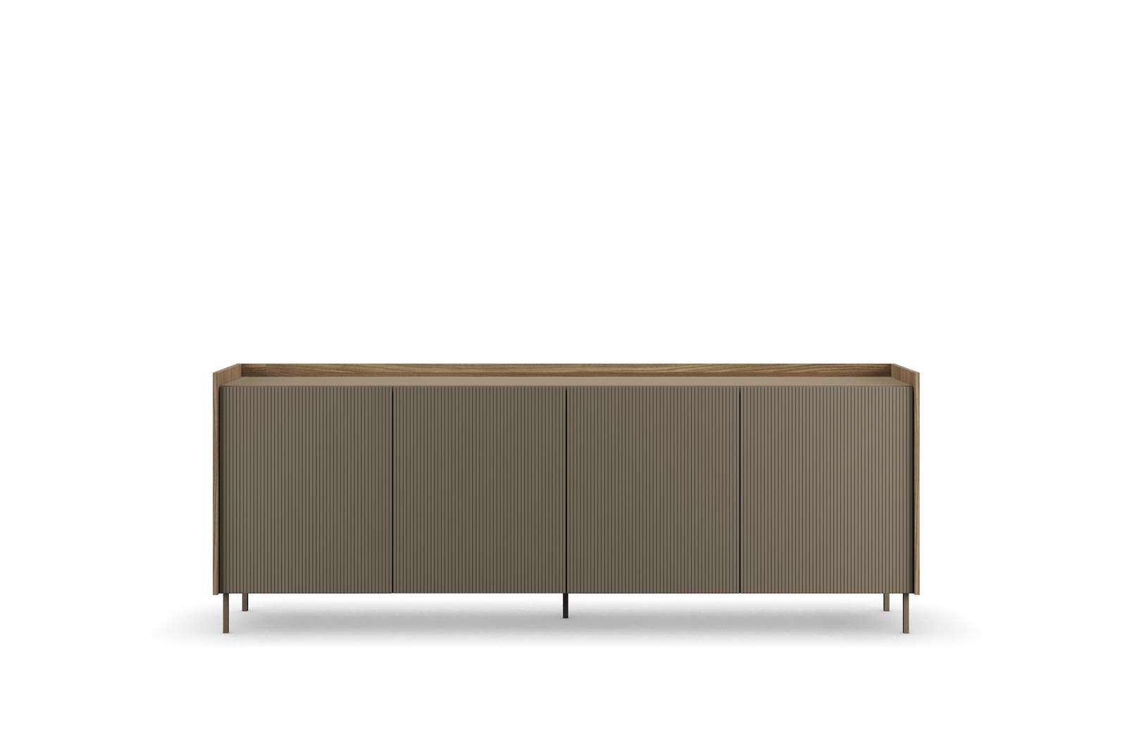 Madia Libra in olmo terra, laccato ecrù, ante con lavorazione cutting e piedi in metallo verniciato bronzo seta. Dimensioni: L 221,6 H 99,6 P 48