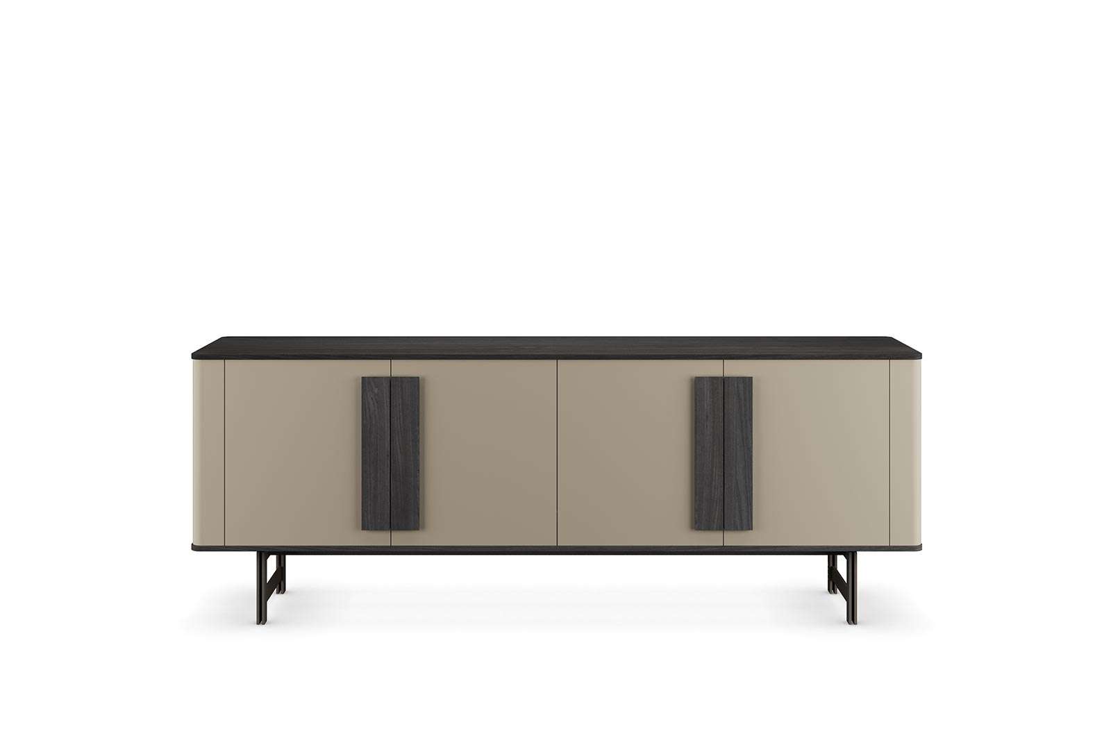 Madia Edra in olmo terra, laccato ecrù, ante con lavorazione cutting e piedi in metallo verniciato bronzo seta. Dimensioni: L 223,2 H 80 P 48