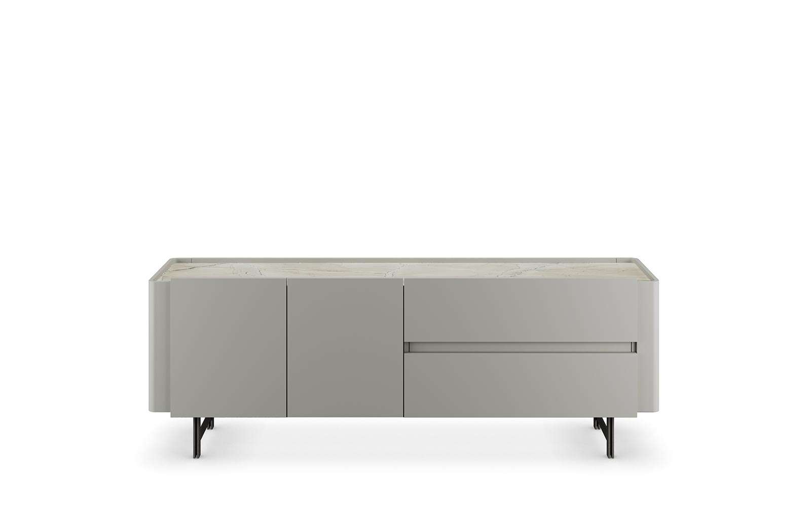 Madia Surf in laccato grigio silk, top in hpl marble sand e struttura in metallo laccato titanio. Dimensioni: L 220 H 81,8 P 54,7 cm