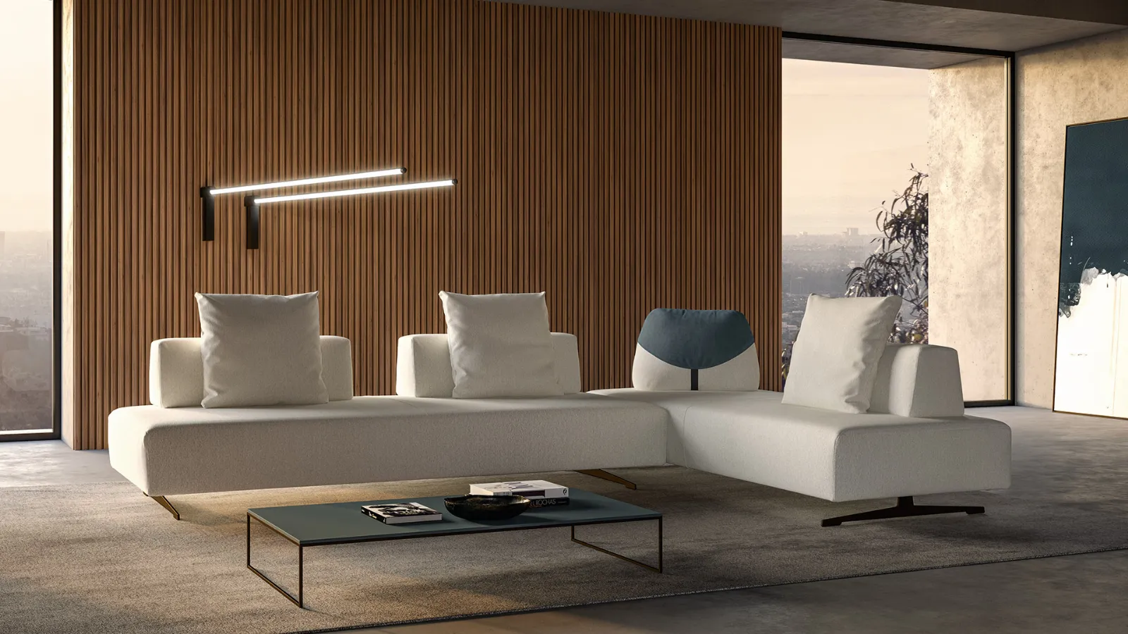 Un divano sospeso con bracciolo minimalLe linee decise ed essenziali e il basamento alto di questo divano sono elementi caratterizzati e funzionali di questo modello.