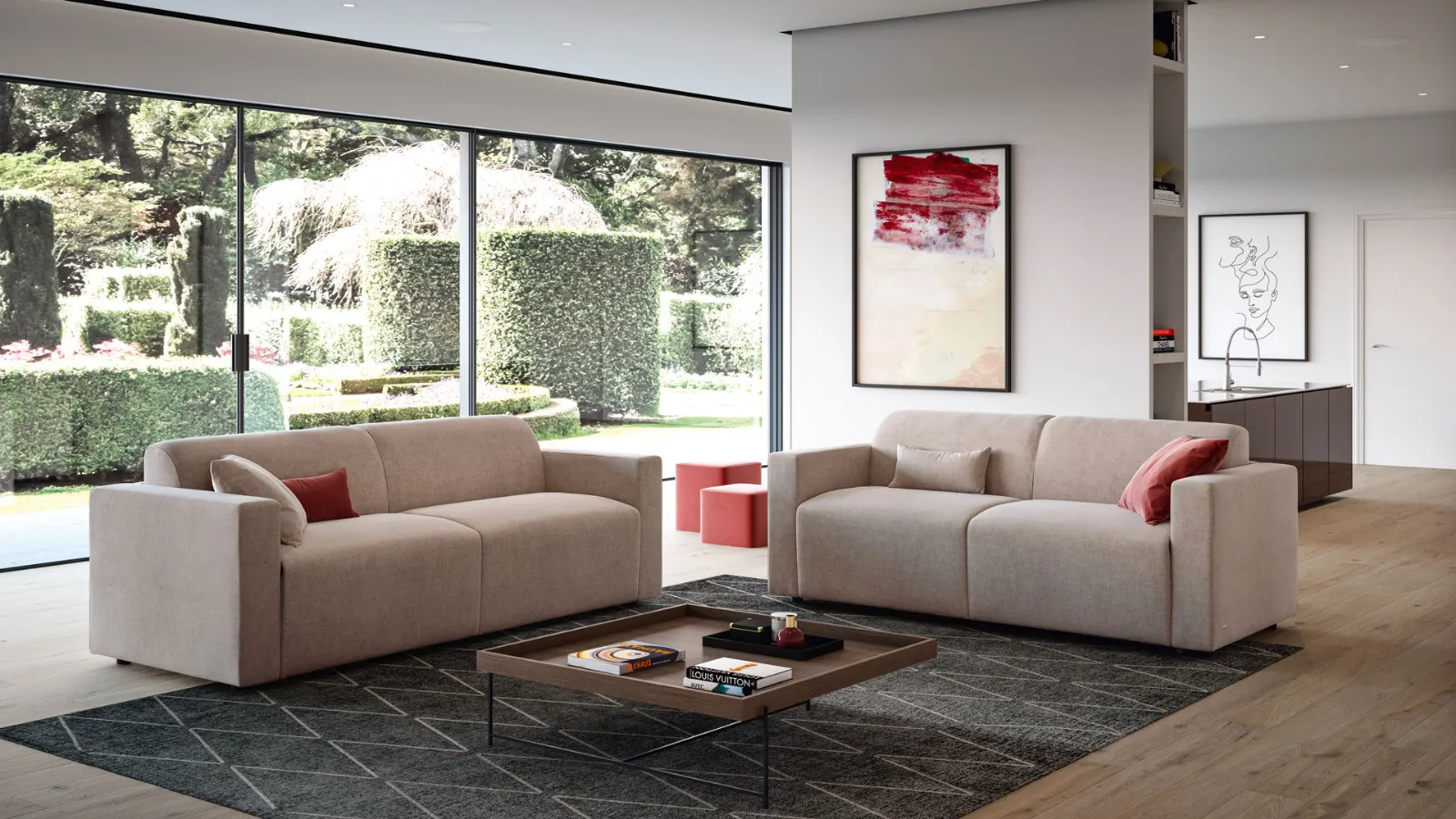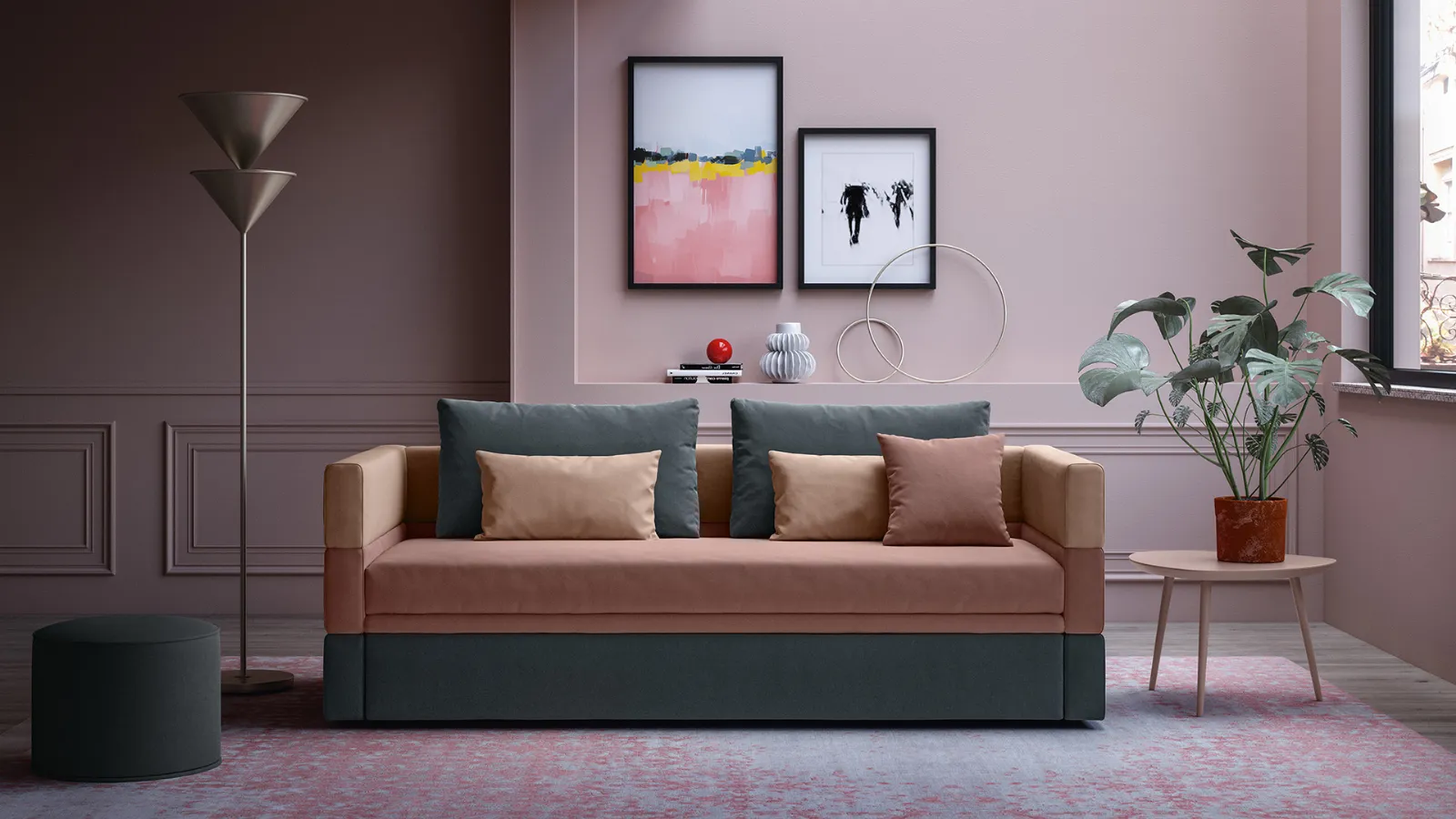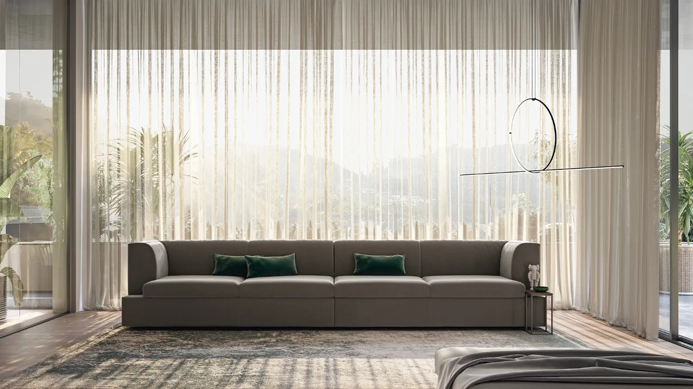 MISURE CONTENUTE E SOLUZIONI COMPONIBILILa componibilità di Tim permette di realizzare divani letto lineari per appartamenti moderni con tre o quattro grandi sedute, sulle quali