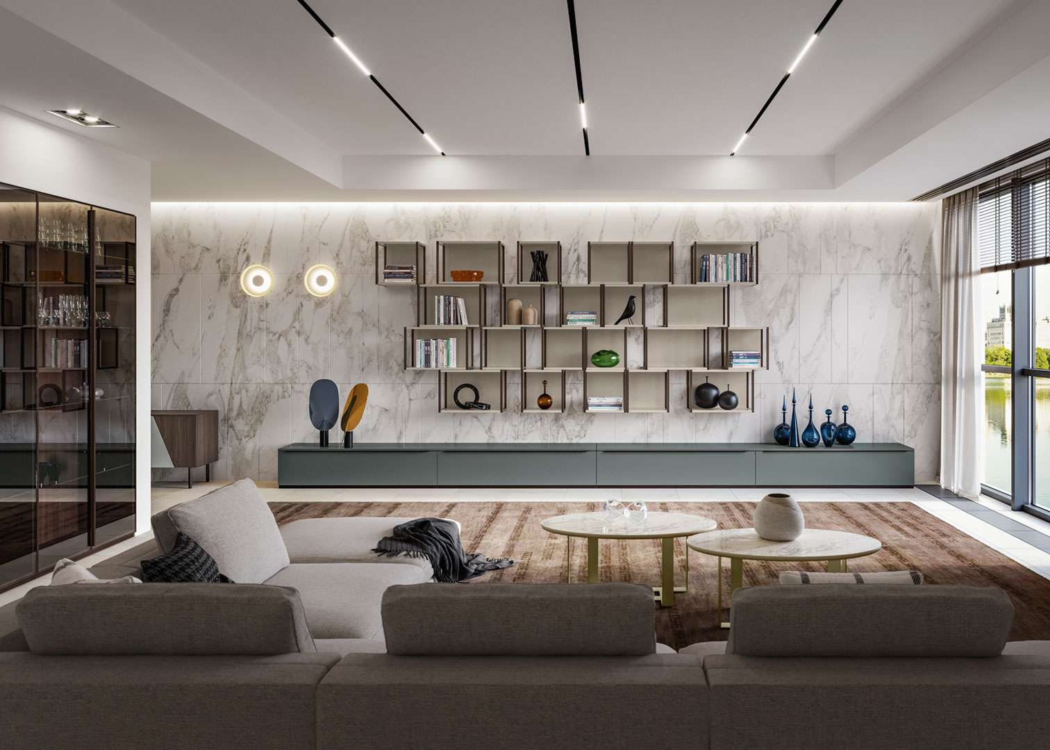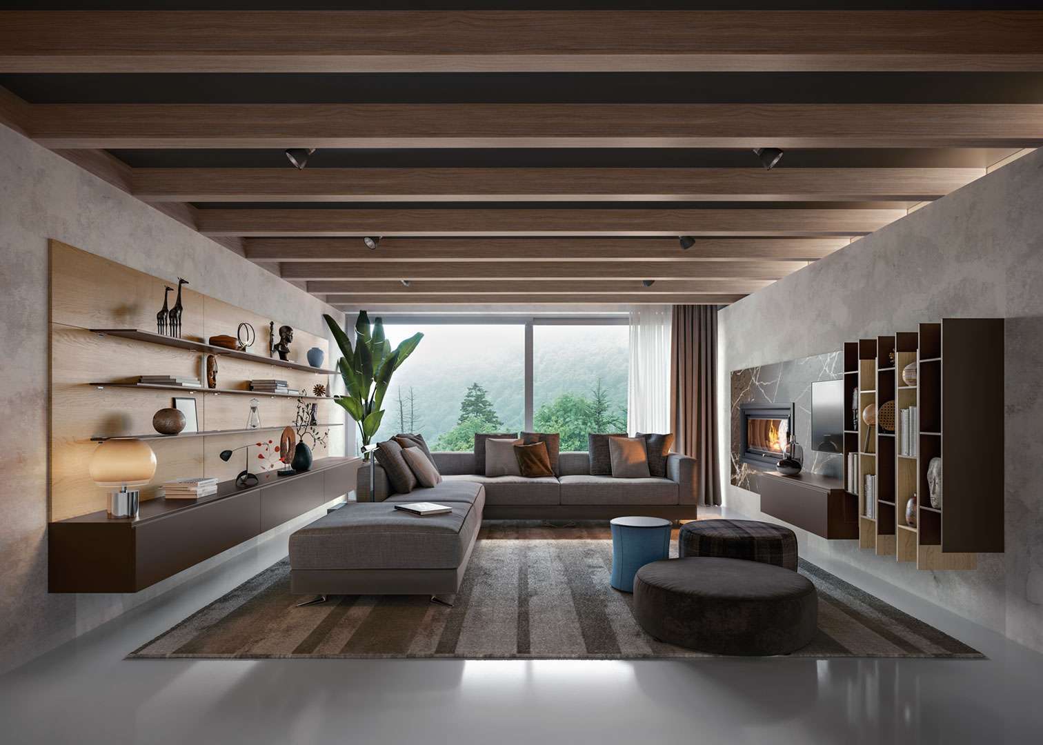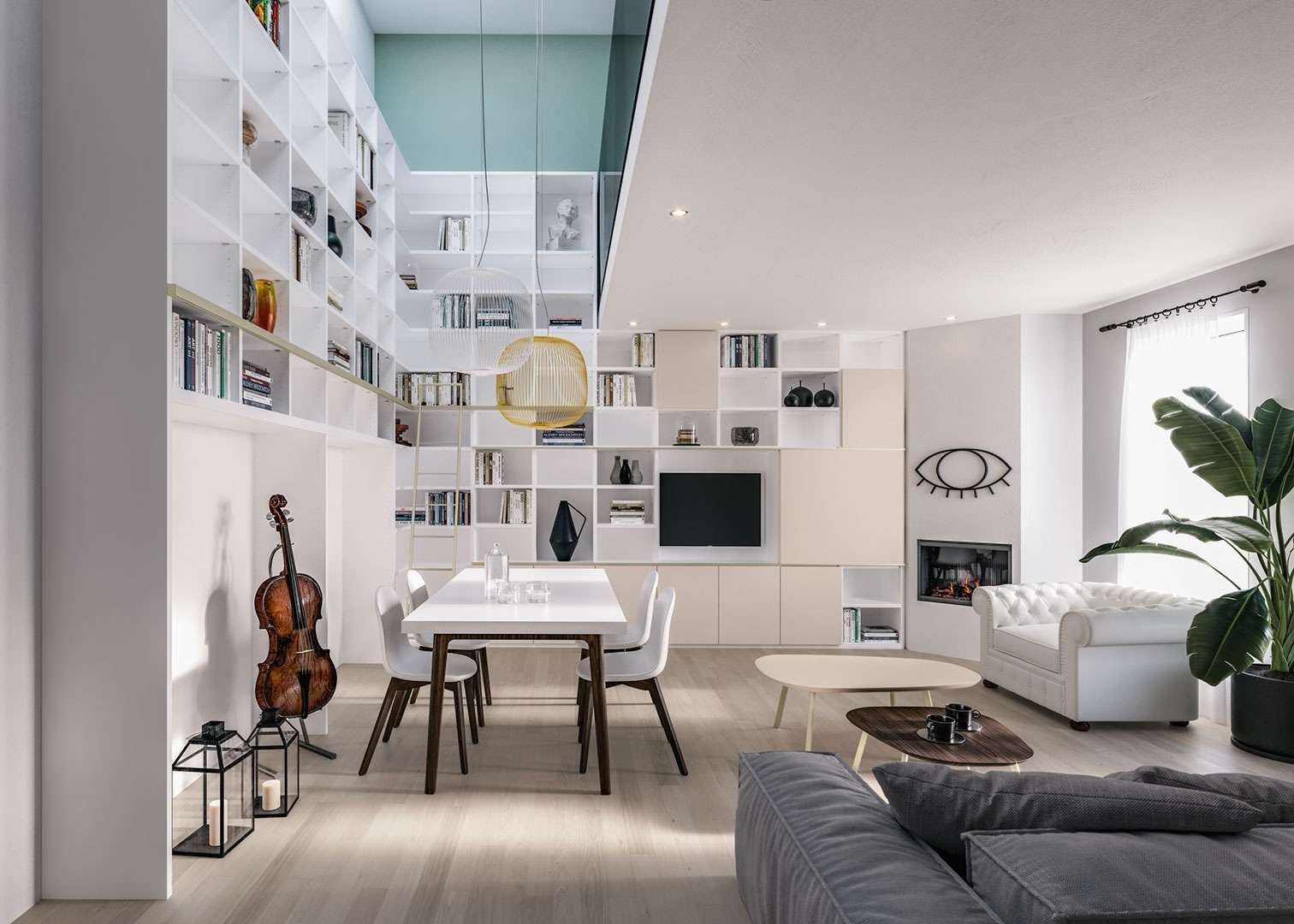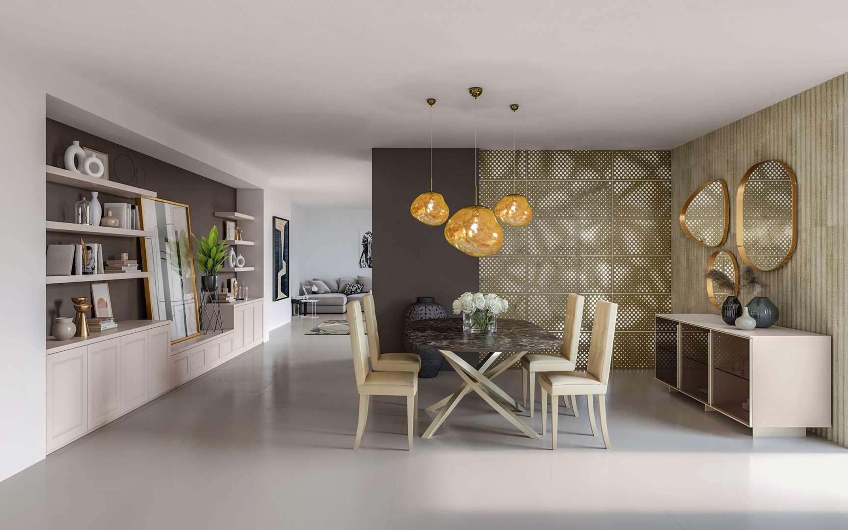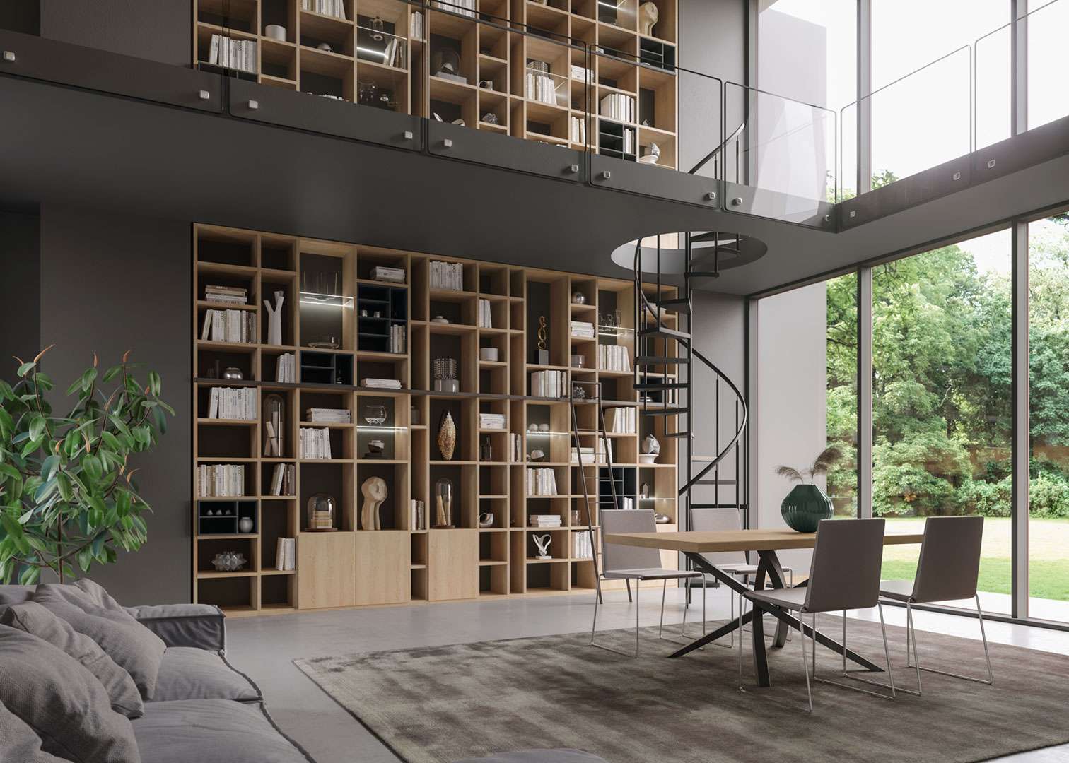 Per il tuo soggiorno scegli la libreria tinta neutra che occupa tutta la parete e regala un effetto tono su tono. Perché la raffinatezza è