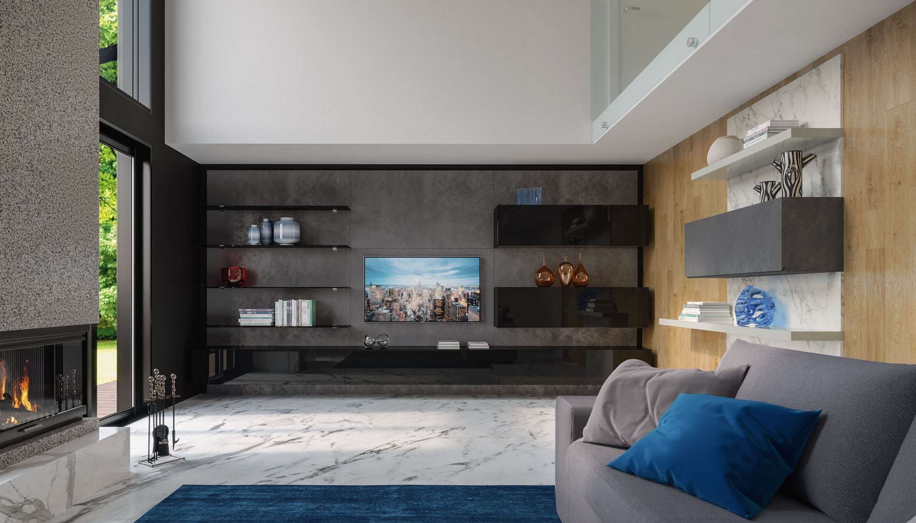 Il marmo e la pietra grigia danno vita ad un’eleganza senza tempo. PareteL.180/120 • H.234 • P.33,6Boiserie con vasistasL.120MensoleL.180/120Parete con tvL.441,6 • H.234 • P.42/33,6