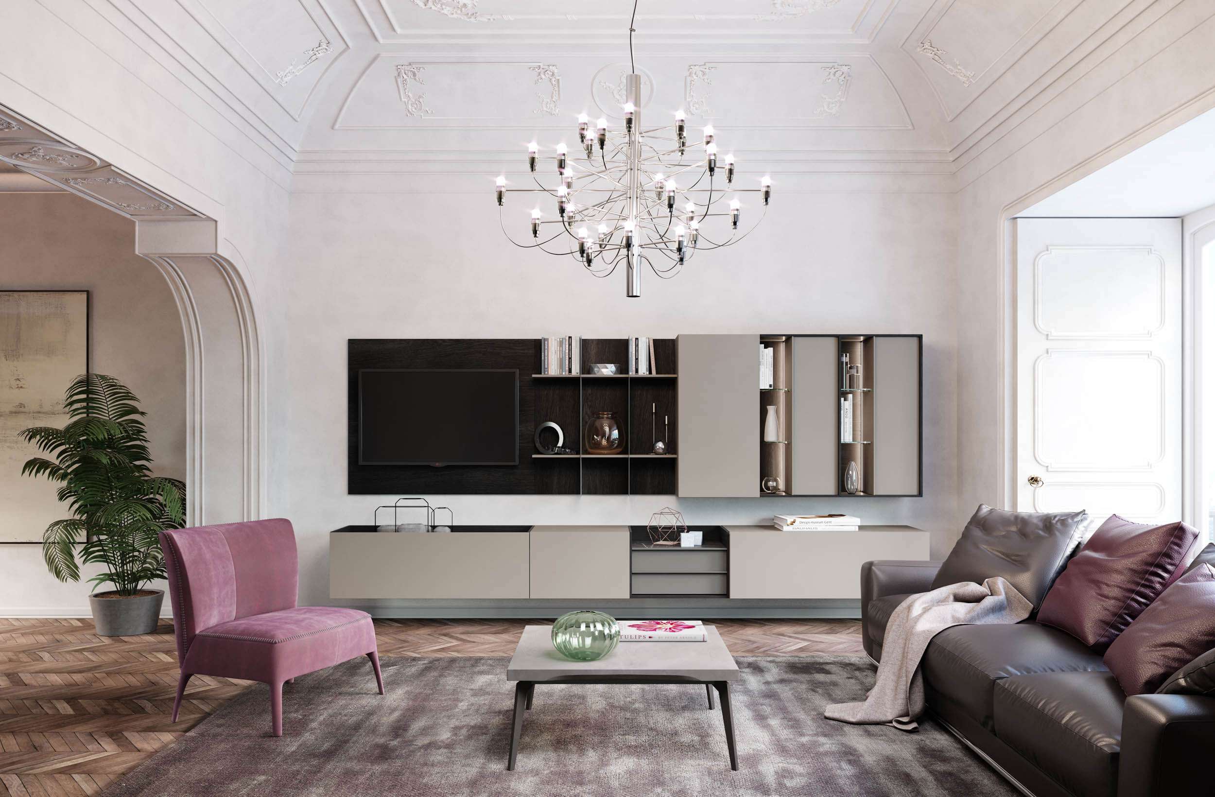 Sistema giorno Skyline 3.0 in laccato ecrù, struttura e boiserie olmo creta, cassetti, mensole retroilluminate in metallo laccato moka, porta TV in laccato moka e