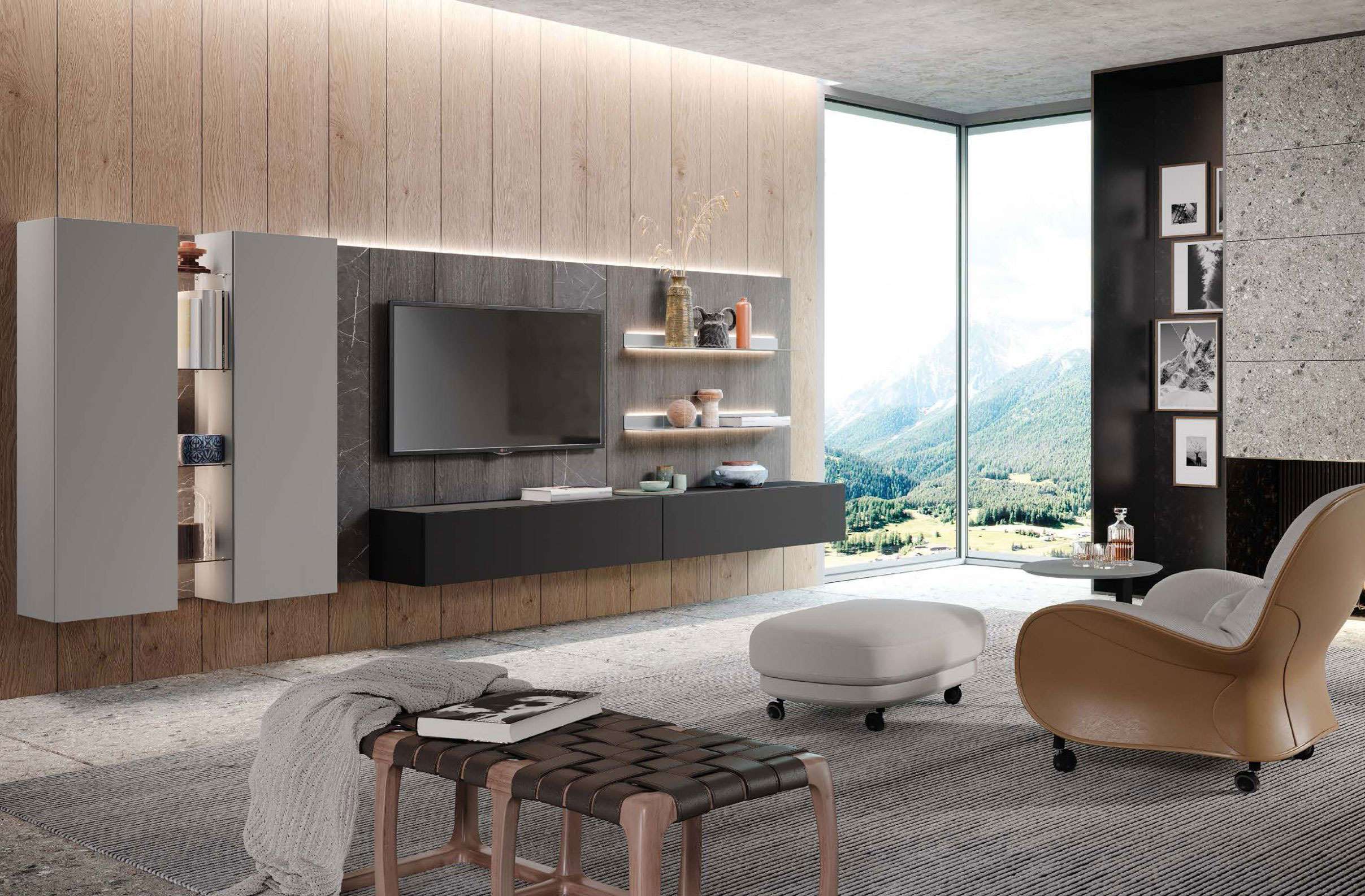 Sistema giorno Skyline 3.0 con pensili in laccato grigio ardesia, boiserie cemento grigio ardesia, bussolotti in laccato grigio ferro, mensole retroilluminate in metallo laccato grigio