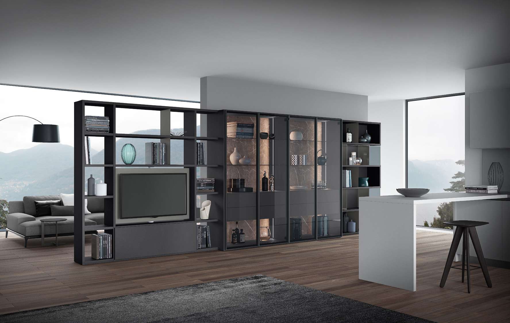 Una proposta Mood bifacciale con struttura laccato opaco grigio antracite 49, schienali delle vetrine in marmo grafite brown effetto soft touch. Ante e divisori in