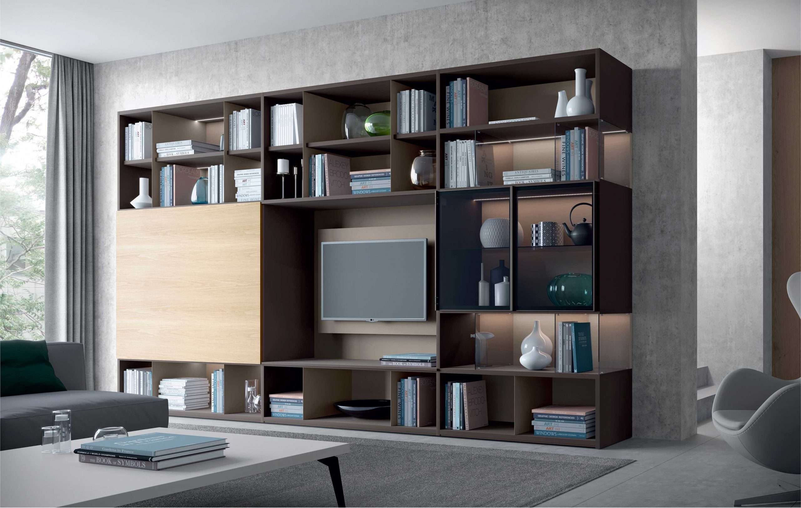 In questo servizio, composizione Mood con struttura laccato opaco moka e schienali in rovere artico, gli elementi strutturali e portanti Clear Mood in vetro fumè