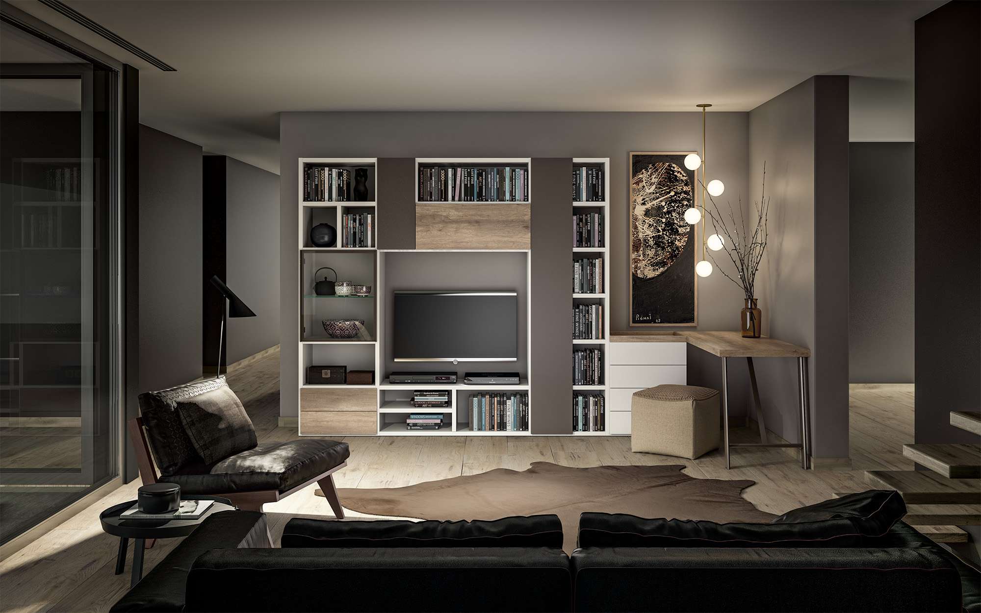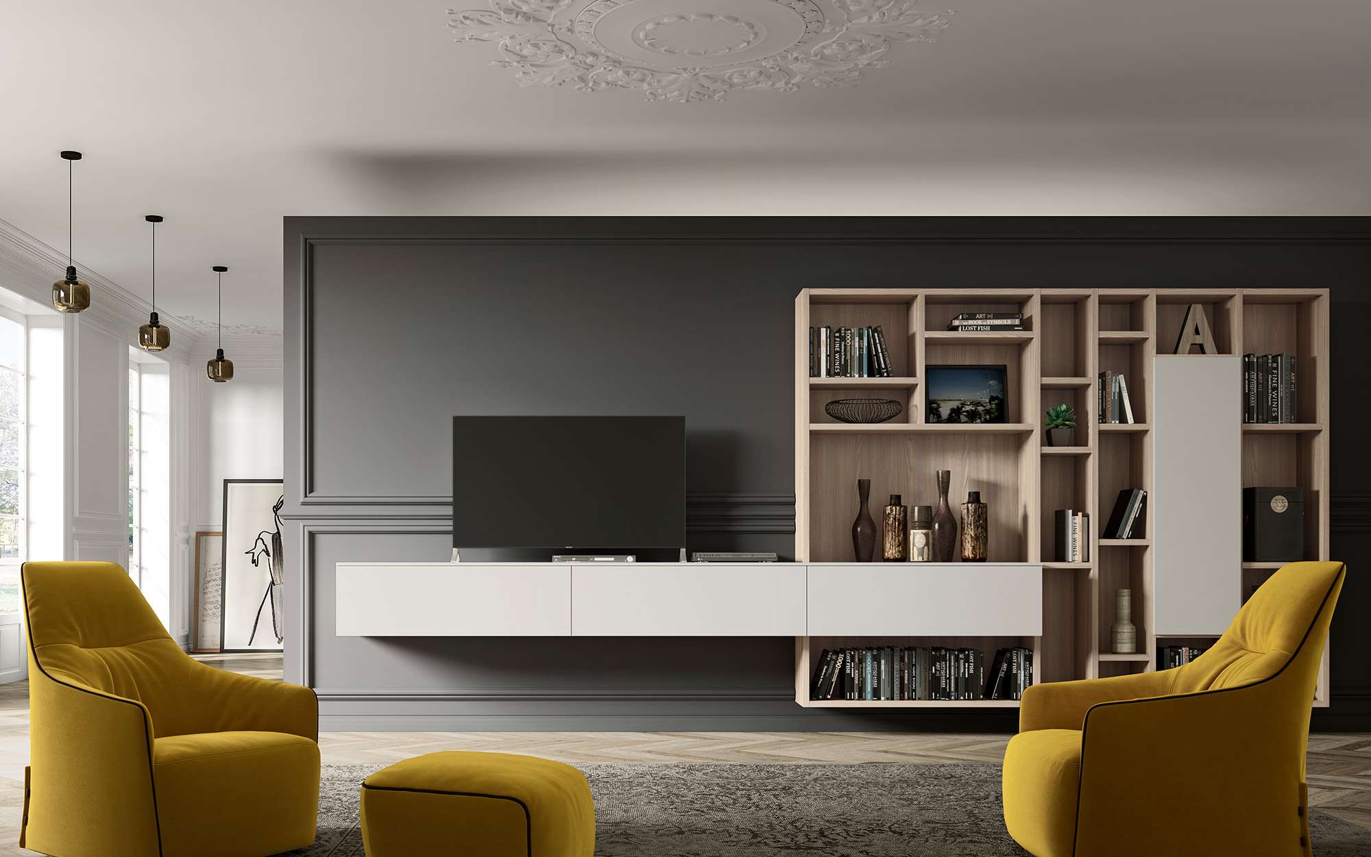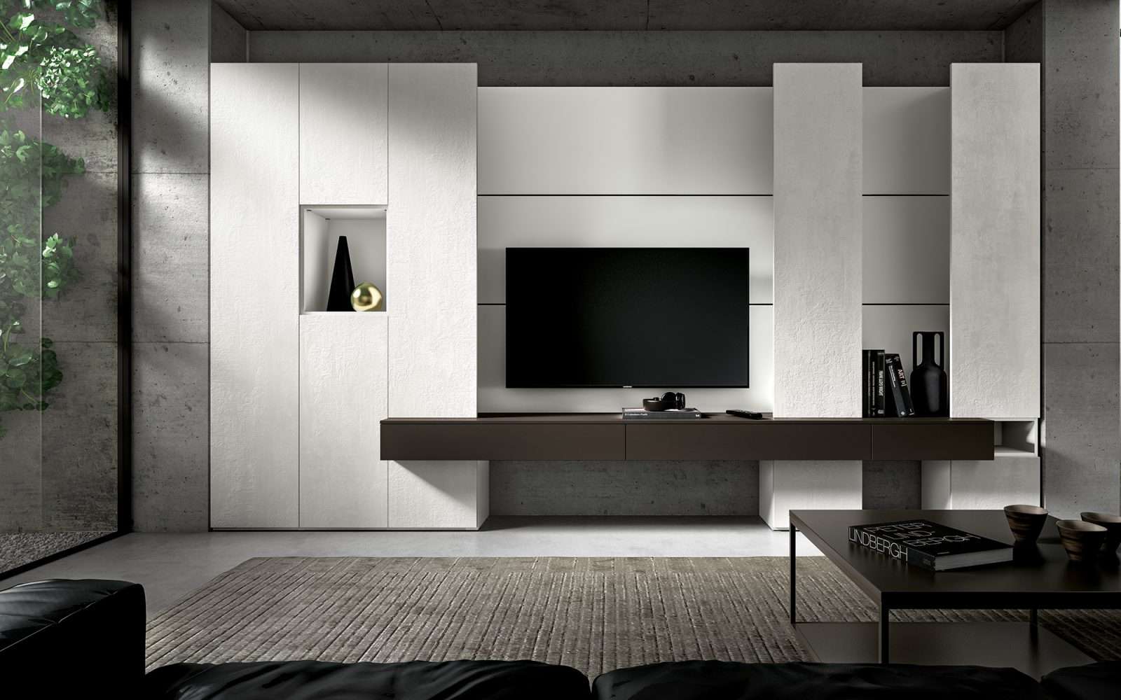 Composizione soggiorno con alloggio per televisore, con cassetti orizzontali sporgenti e colonne con ante verticali.