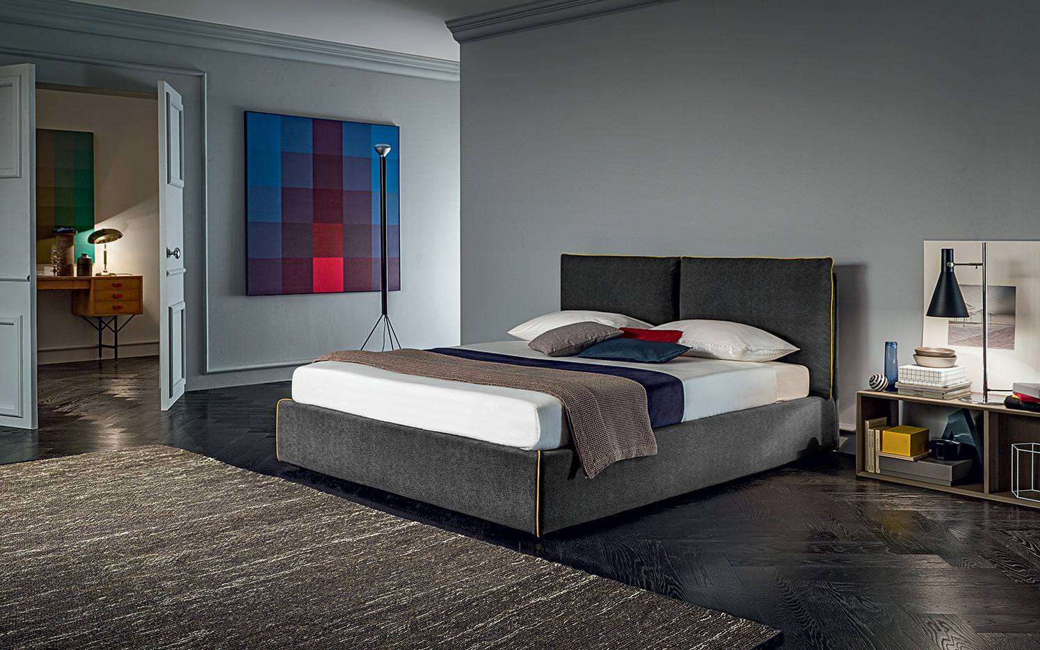 L’eleganza della semplicità. Luis ha un cordoncino in colore a contrasto sui bordi dei grandi cuscini della testiera e sugli angoli di giunzione ai piedi